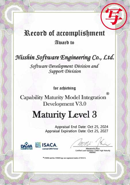 2024年10月、ソフトウェア開発プロセスの能力成熟度を示すCMMIの公式アプレイザルを受査し、
