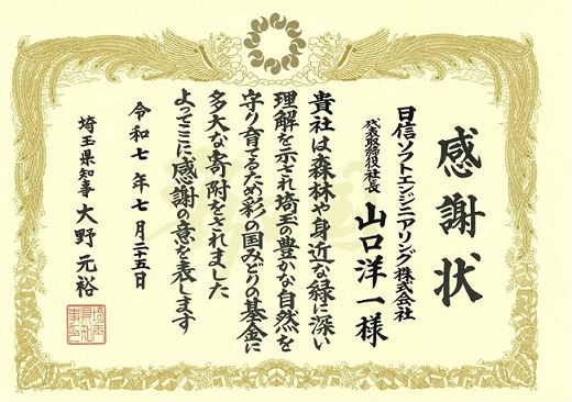 この度、彩の国みどりの基金より、昨年度の募金活動に対し、埼玉県知事公館にて感謝状の授与および、記念品として埼玉県のマスコットキャラクター、コバトンのぬいぐるみをいただきました。