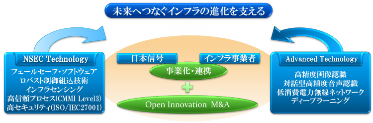 すなわち、NSECが長年にわたってインフラ・フィールドに展開してきたテクノロジー、それによって得られるビッグデータと最先端テクノロジー(インフラセンシング、高精度画像認識、対話型高精度音声認識、低消費電力無線ネットワーク、ディープラーニングなど)を融合させ、お客さまの視点に立った「価値の高いソリューションやサービスを提供できる企業」を実現していきます。