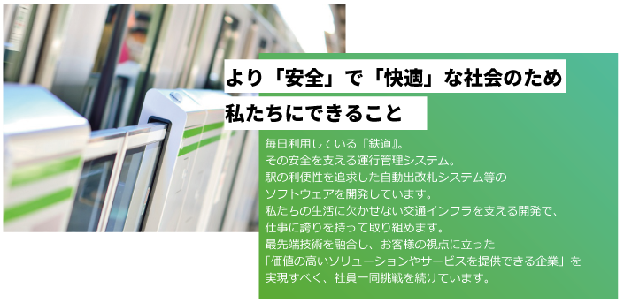 当社は交通運輸インフラ機器を通し「安全」と「信頼」を 社会へご提供しています。 公共性が極めて高いシステムのソフトウェアを、強い責任感と 使命感で開発し、ともに成長できる仲間を募集しています。