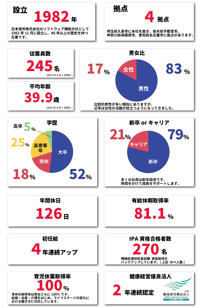 事業内容や従業員に関するデータ、職場環境や制度などについて 数字でご紹介します。
